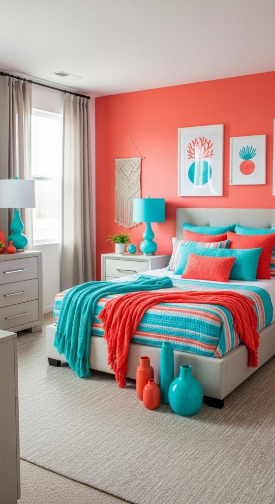 - Bedding: Mix coral and turquoise bedding with neutral elements to soften the palette.