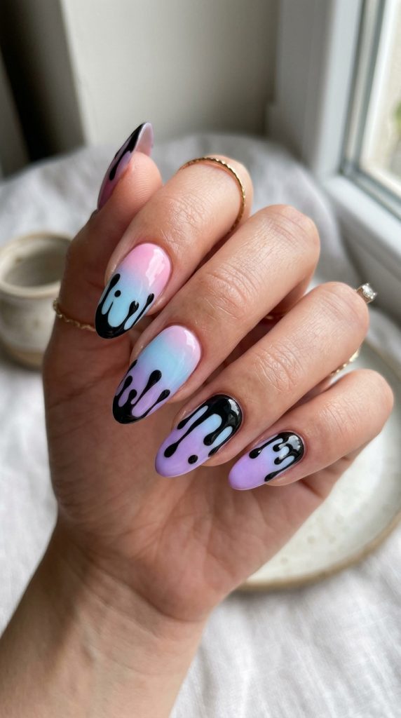 10. Gradient Pastel Nails with Black Drip Design
