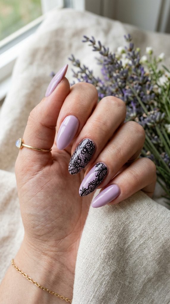 9. Lavender Nails with Black Lace Accents