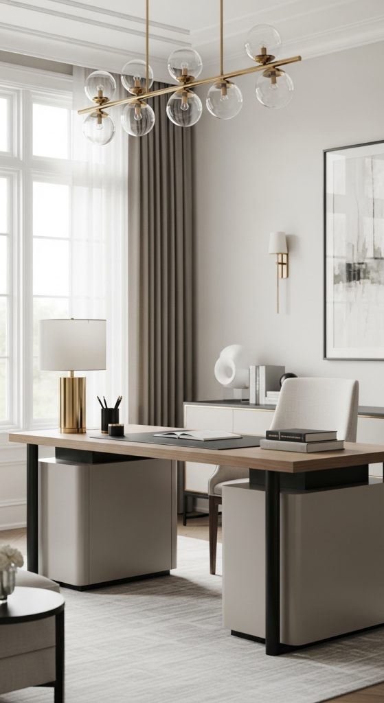 Lighting is the difference between a workspace that feels energizing and one that causes fatigue. Most home offices rely on a single ceiling light, which creates flat brightness and eye strain. Luxury offices use multiple lighting layers for control and comfort.
