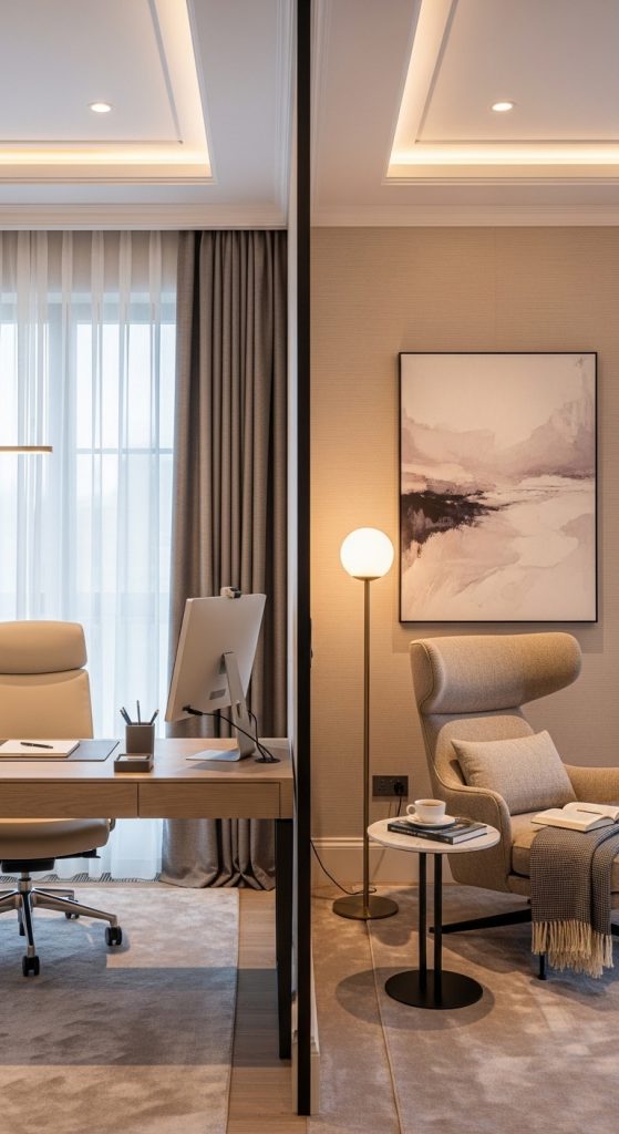 Most home offices fail because they force one mood into everything. Either the room feels too stiff and stressful, or it becomes too relaxed and distracting. Luxury workspace design solves this by separating mental zones inside the same room.