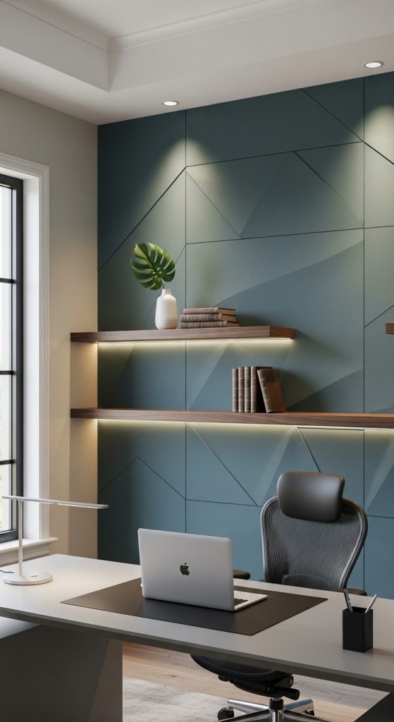 A single accent wall behind or near the desk designed with texture, color contrast, shelving, or subtle patterns. It frames the workspace and adds depth without overwhelming the room.