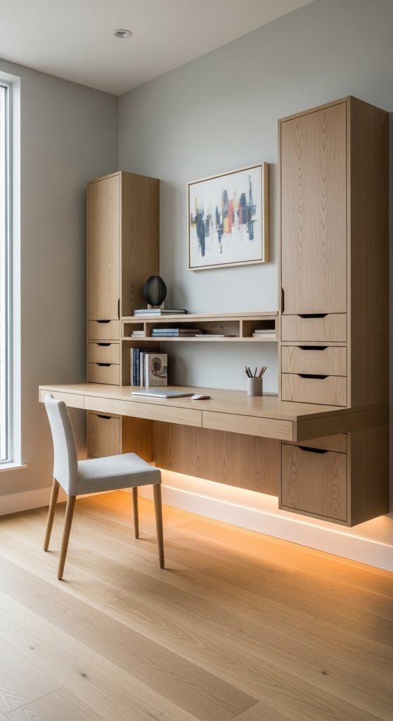 8. Minimal Floating Desk Wall System (Space-Saving Luxury Design)