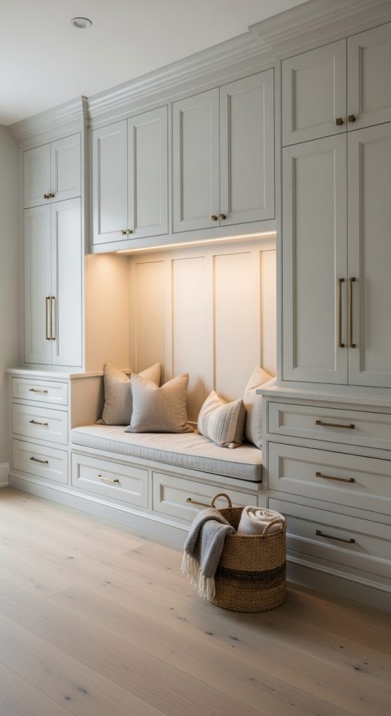 Tall storage cabinets are one of the best ways to hide bulky or unsightly items while keeping your mudroom looking clean and cozy. This idea focuses on using vertical cabinet space to store items like cleaning supplies, sports gear, extra shoes, seasonal accessories, and pet supplies out of sight.