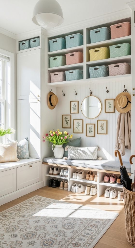 This storage decor idea is especially effective in narrow mudrooms or small entryways where floor space is limited.