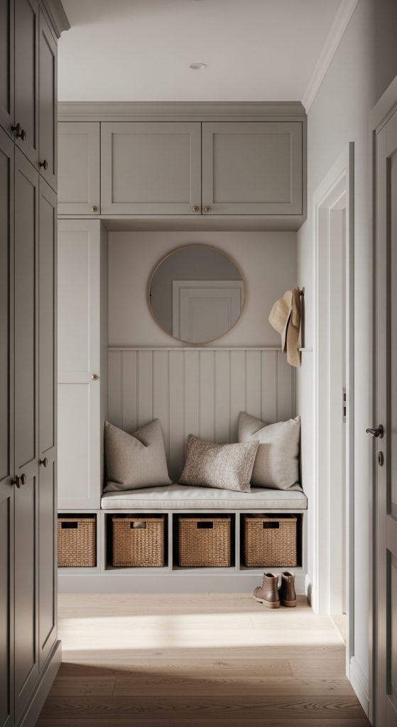 Using baskets under a bench is a smart way to add hidden storage while keeping your mudroom visually calm. This idea utilizes often-unused space beneath seating to store shoes, accessories, pet supplies, or seasonal items.
