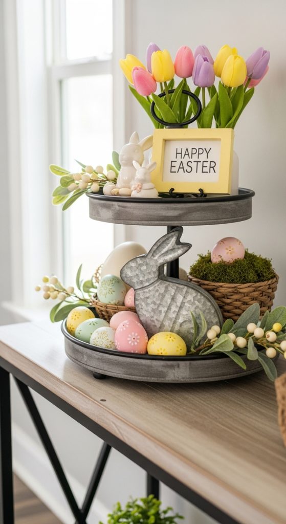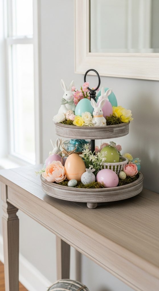 A tiered Easter tray is a multi-level display for small seasonal decorations, designed to create height and visual interest on an entryway console or table.