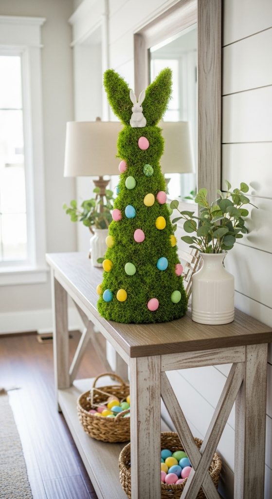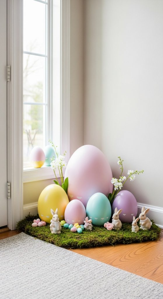 A pastel egg floor display adds charm to the entryway and draws attention downward, complementing wall or table decor. Using a mix of large and small eggs, faux moss, and bunny figurines, you can create a playful, Pinterest-worthy setup on the floor.