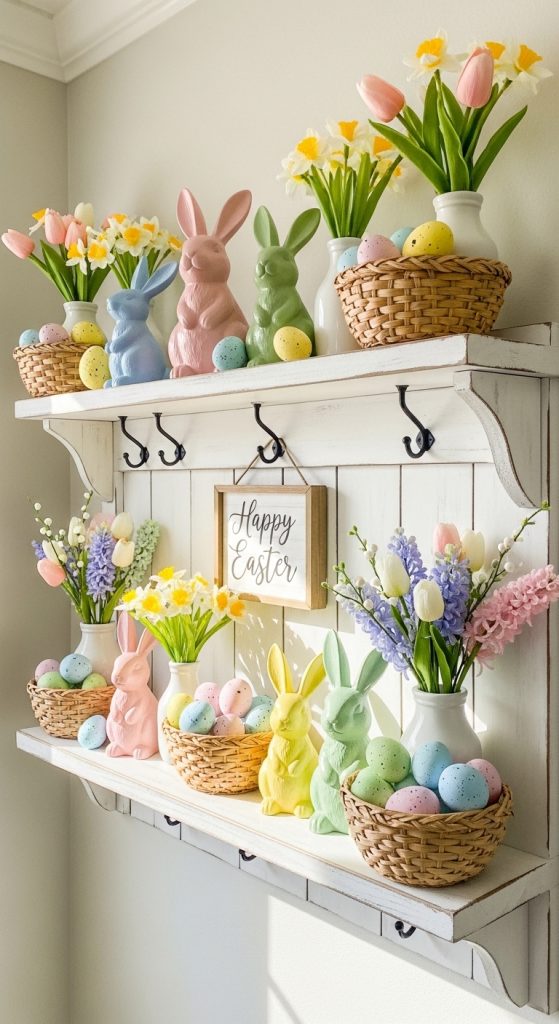 Wall shelves in the entryway provide an ideal vertical space to showcase Easter decor. By placing small bunny figurines, pastel eggs, seasonal signs, and floral accents on shelves, you can create a layered and curated look.