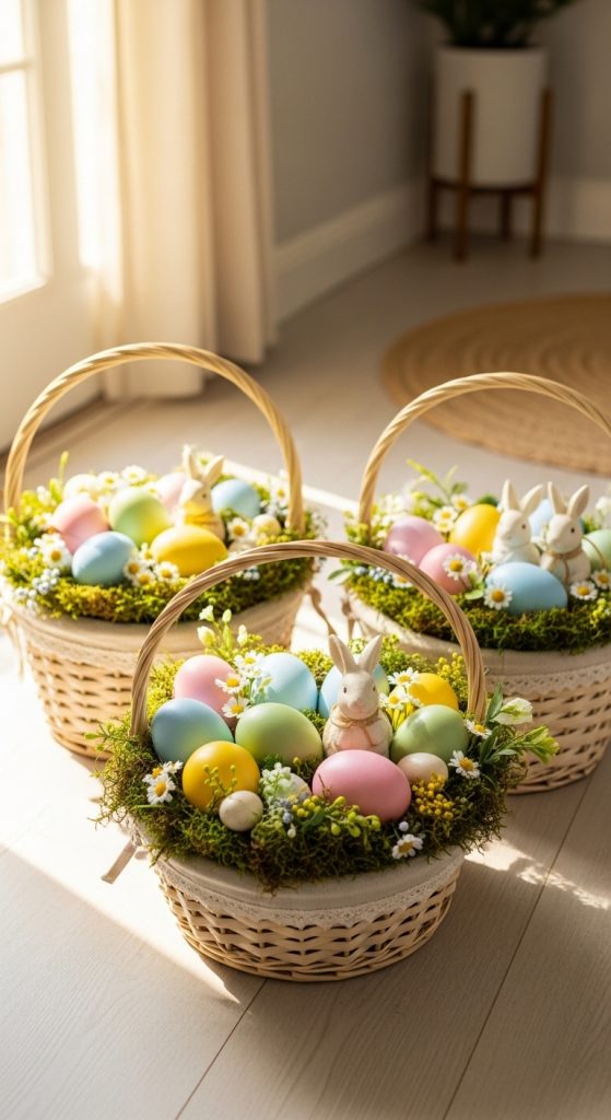 - Fill baskets with faux moss, pastel eggs, or candies
