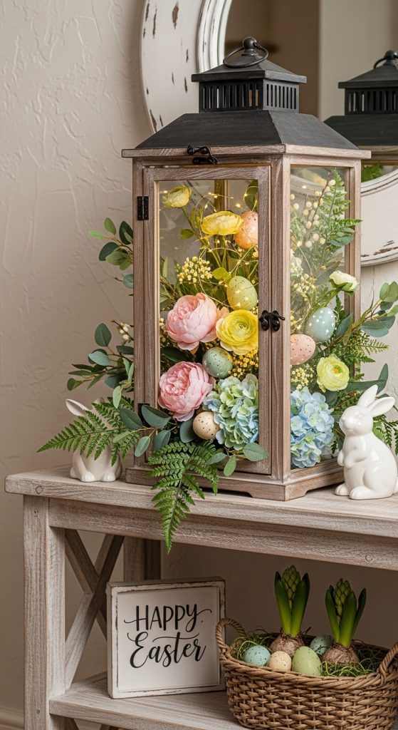 Decorative lanterns filled with Easter florals provide a soft, welcoming ambiance in your entryway. By placing pastel flowers, greenery, and small Easter accents inside a lantern, you create a charming, eye-catching focal point. Lanterns add height and elegance, making them perfect for console tables, entryway corners, or floor displays.