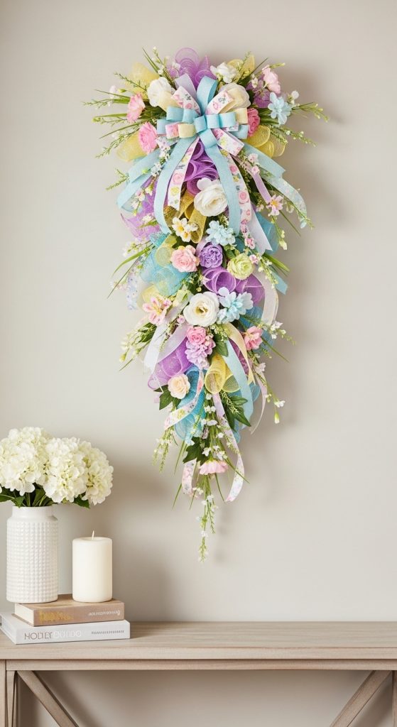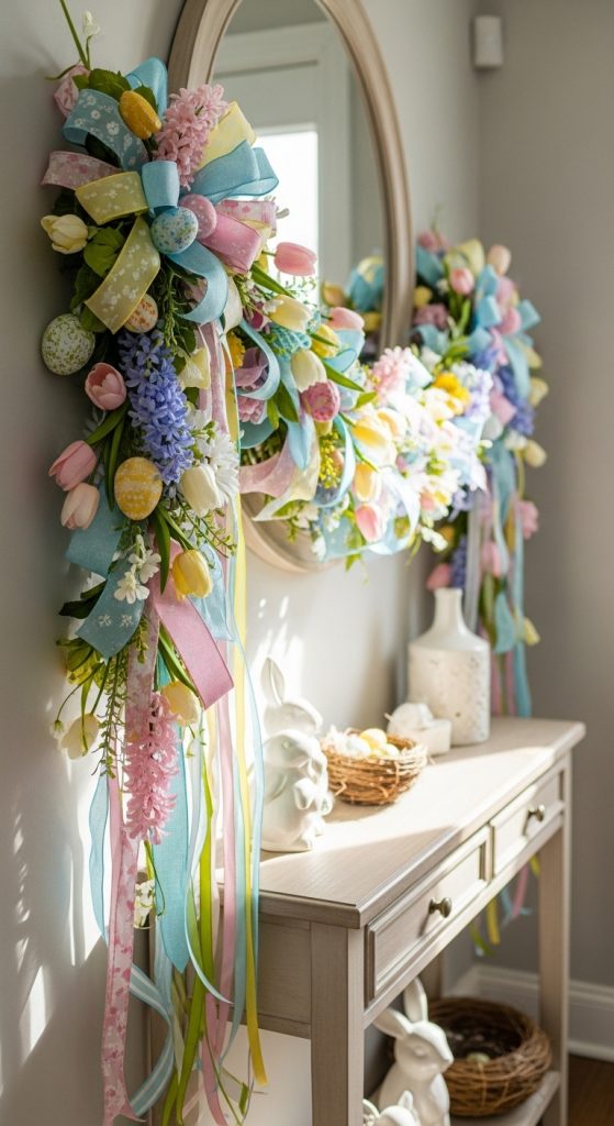 A ribbon garland adds color, movement, and charm to your entryway. Using pastel ribbons, faux flowers, and small Easter accents, you can create a garland to hang along a console table, staircase, or wall.