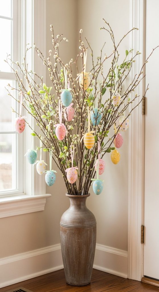 A DIY Easter egg garland adds whimsy and color to your entryway walls. Hanging a string of pastel eggs along a wall, staircase railing, or console table backdrop creates visual interest and a playful vibe. This project is highly customizable: you can mix colors, patterns, and textures to complement your existing decor. Dollar store eggs and basic twine or ribbon make it budget-friendly while still achieving a Pinterest-worthy look.