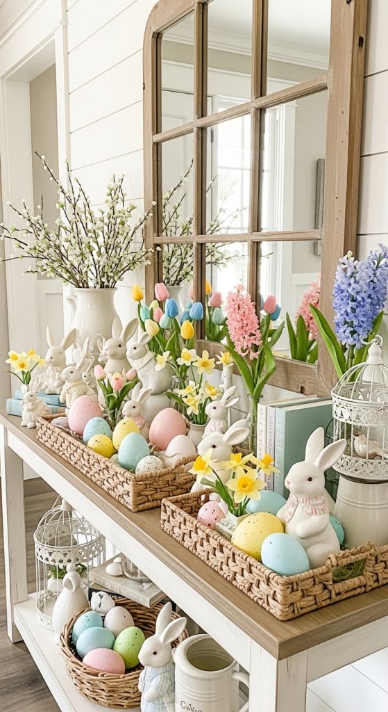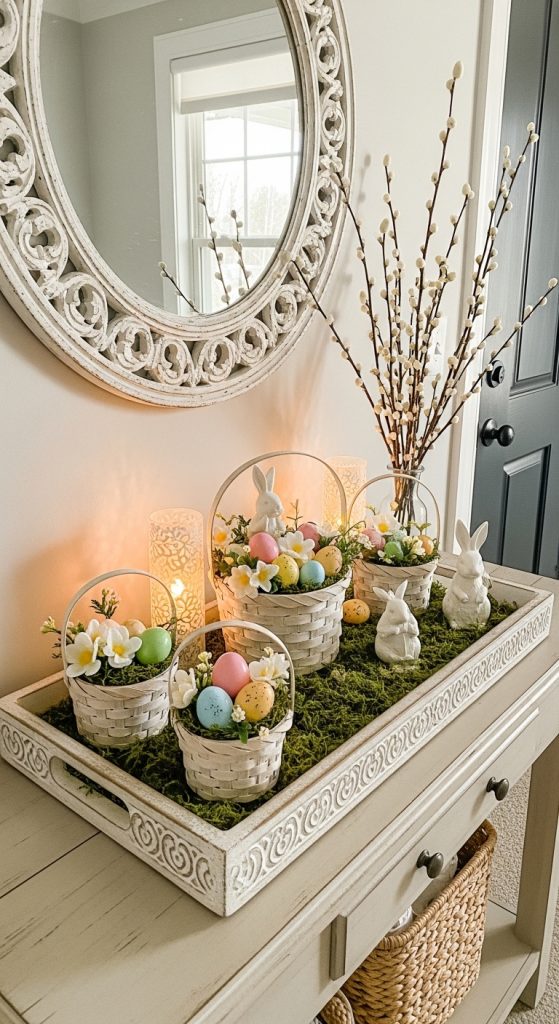 A table tray with mini Easter baskets is perfect for a compact entryway table. You can arrange small baskets filled with pastel eggs, faux moss, and mini bunnies to create a cheerful, layered display.