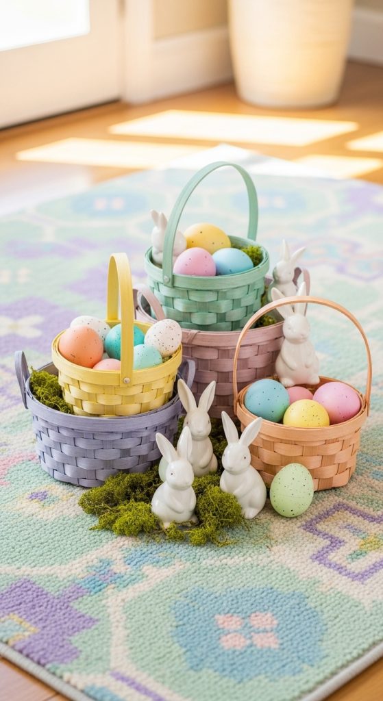 A simple way to welcome guests is with a pastel Easter entryway rug complemented by seasonal decor. Layering a soft pastel rug with Easter baskets, bunny figurines, and floral accents instantly brightens your entryway. The rug not only serves a functional purpose but also acts as a visual base for your seasonal styling.