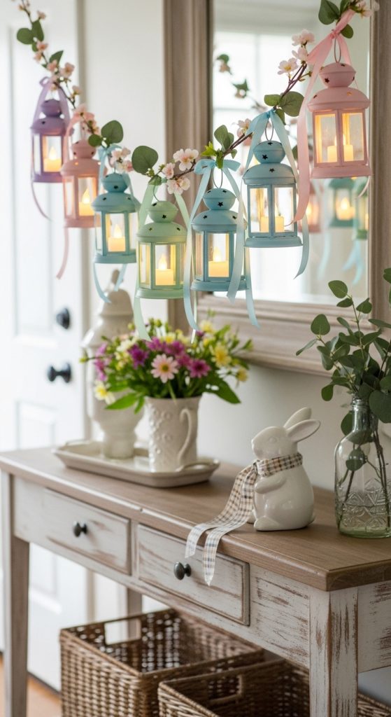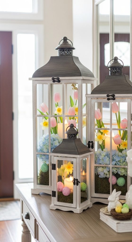 Grouping lanterns is an easy way to create height, dimension, and cozy ambiance in your entryway. Using a set of three lanterns of varying sizes, you can style pastel accents, faux florals, and mini eggs inside each lantern. The layered look draws the eye and creates a Pinterest-ready seasonal focal point.