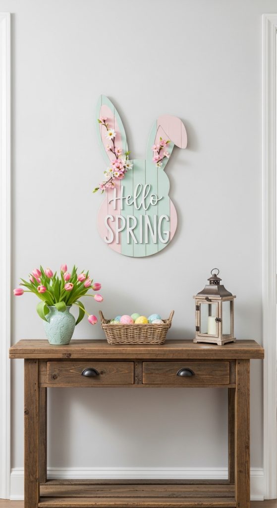A bunny wall sign adds personality and charm to your entryway. By customizing a wooden sign with Easter motifs, pastel paint, and festive lettering, you create a welcoming focal point. This DIY is ideal for a minimalist wall or above a console table, adding both seasonal cheer and style.