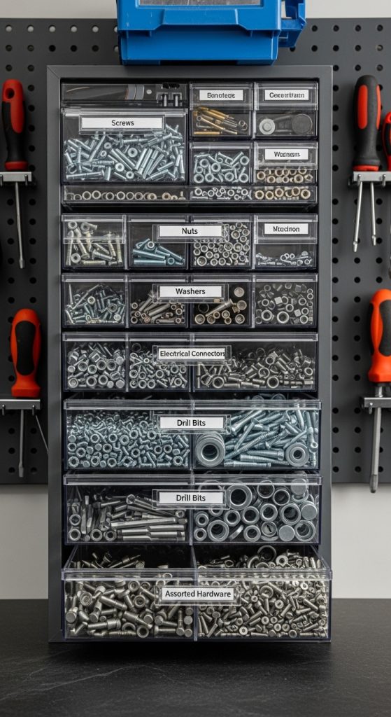 Clear drawer organizers or wall-mounted parts cabinets make it easy to find exactly what you need.