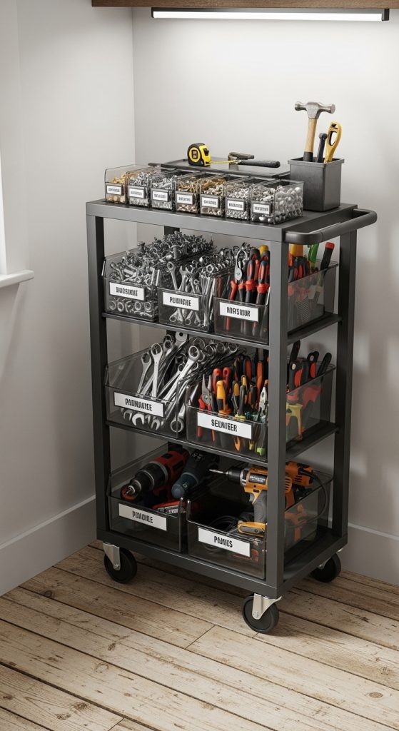 Narrow carts fit beside walls when not in use. They’re perfect for active projects that require multiple tools at once. Instead of walking back and forth, everything moves with you.